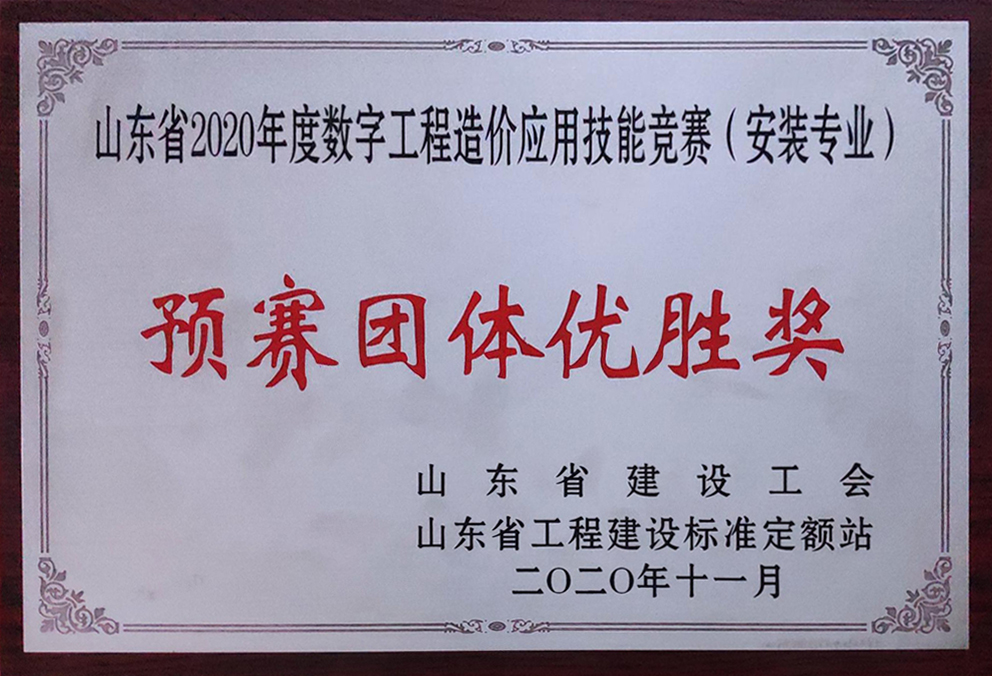 我公司在山東省2020年度全省數字工程造價應用技能競賽(安裝專業)預賽中獲得“預賽團體優勝獎”(全省共16個單位獲此殊榮),我公司員工崔建磊、林文芳同志獲得“崗位能手”馬鑫同志獲得“優秀選手”(全省共有50名選手、臨沂共有4名選手獲此殊榮)。在臨沂十位參賽選手排名中我公司職工分別獲得崔建磊第一,林文芳第三,馬鑫第四的佳績!